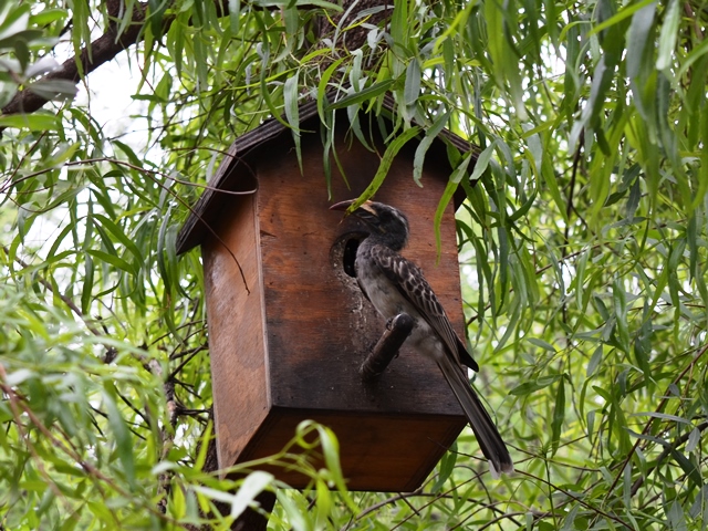 GRYSBEKNEUSHORINGVOEL – Met sy skril fluitgeroep verskil die grysbek se geroep drasties van dié van die geelbek en rooibek wat weer dieselfde klink. Leeupoort is gelukkig om al drie hierdie soorte neushoringvoëls te kan hê. Hulle bly redelik uit mekaar se pad. Op Leeupoort is `n inwoner wat die broeikaste maak en daar is `n hele klompie inwoners wat kaste aangeskaf het en by die huise aan bome aangebring het. Hierdie kaste se ingang moet in `n sekere rigting aangebring word en die grootte en hoogte is ook `n faktor.